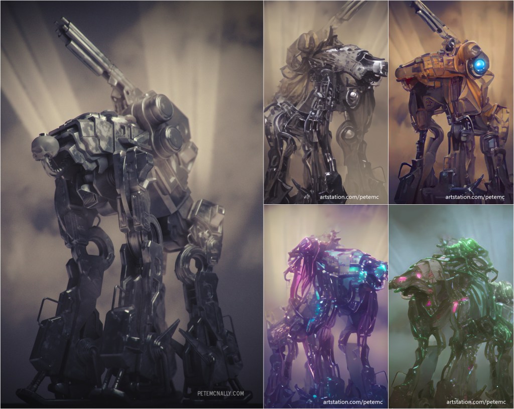 Tumbleweeds here! Anyway, I’ve been experimenting with Wombo Dream lately on my phone for some AI assisted art creation. In this collage, I used an unfinished mech image (left) as an input https://www.artstation.com/artwork/9EWZO, and then mutated it in Wombo with various styles and text phrases. I think it’s a really useful way of generating ideas quickly, even from abandoned or unfinished work, and I’m excited about learning ways to control and influence the outcome more directly. (I’ve signed up for the more impressive ones, like Midjourney and Dall-E and if anyone knows a way to get up the list, let me know!)