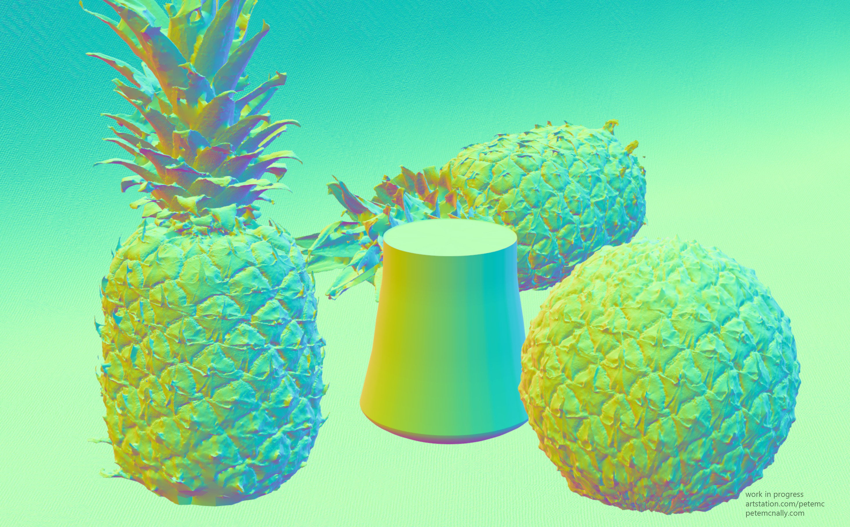 Wow, a year since the Covid-19 pandemic started! I haven’t posted here much since then, but I have been creating lots of stuff over at my Artstation page. Here’s what I’m up to right now, creating a still life scene in Toolbag 4. Since I last posted, I upgraded to a Nvidia card that supports realtime raytracing, and I’m enjoying working with it. It feels like the beginning of the end of all of the fakery and hacks we’ve been using for years, and the results are impressive. I took a pass at a tiling pineapple skin this lunchtime: