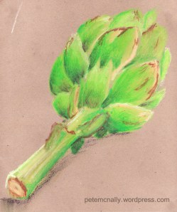Tisn’t often I stray from my comfort zone of pencil work but I have tried chalks, paints and pastels in the past. In fact, I took a portfolio course in Mixed Media studies when I was fresh out of school. This artichoke in pastel on brown scrapbook paper and was stuffed in the back of a college sketchbook where I also found some chalk work that I’ll post up soon.