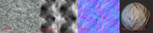 Next was to try some displacement tests. I generated a normal map from the displacements I got out of Mudbox and used it to create smaller wavelets over the larger waves caused by displacement. I then found a choppy water texture on cgtextures.com that tiled and I could use for some diffuse shading. These were the textures used, combined with some Fresnel shading