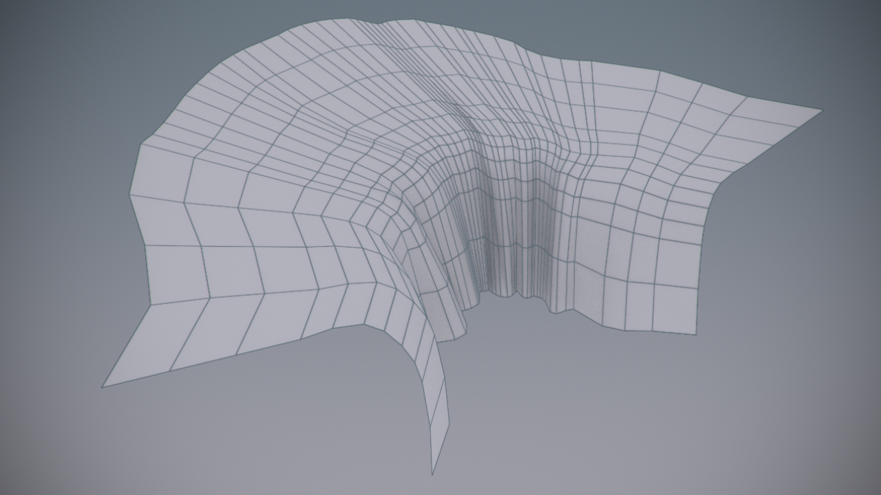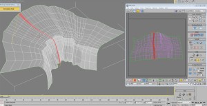 First up, I blocked out some simple geometry and unwrapped it so that the textures would scroll vertically along the UVs, a quick planar map with some UV relaxing did the job reasonably well and a pelt stretch and some further relaxing finished the UVs.I made some tweaks to the geometry to pull out areas of roughness at the edge of the falls.Unwrapping the UVs early meant that I could easily turbosmooth the geometry without having to wrestle with a detailed mesh of 6 or 7 iterations down the road, It looked like this after smoothing (low poly wireframe overlay)