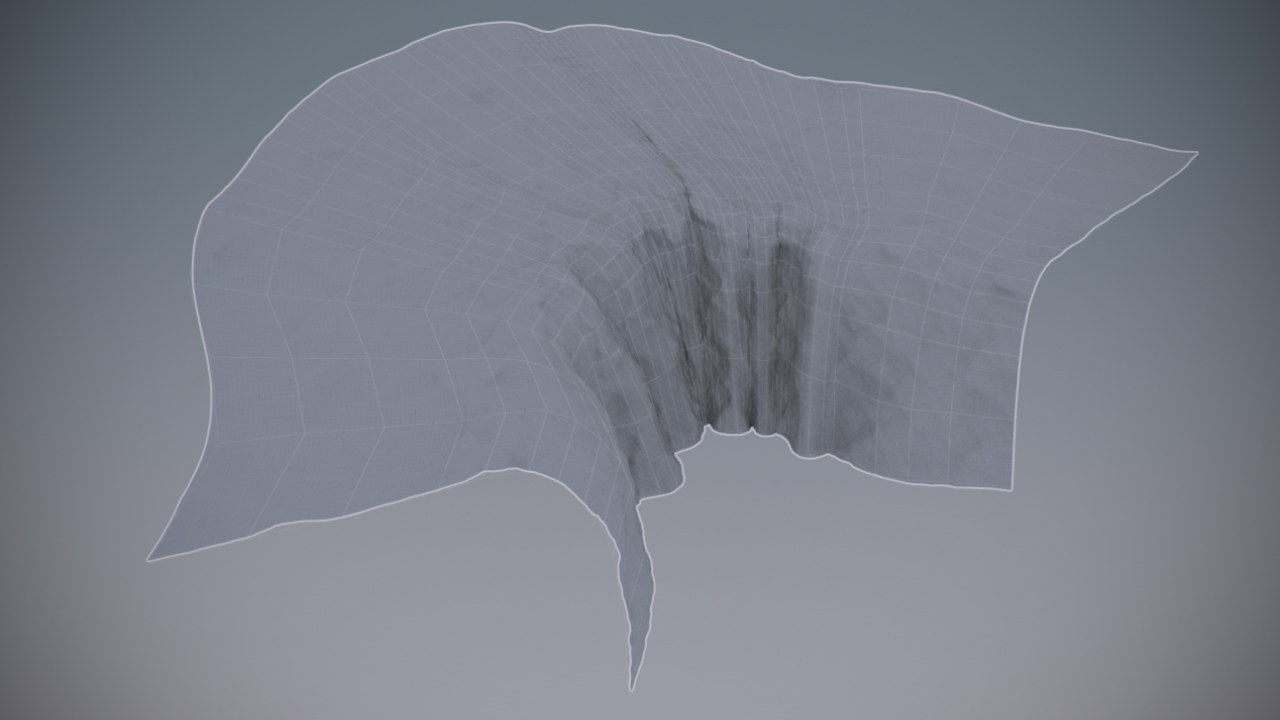 I wanted to suggest a change in the water as it plunged over the falls, churning into foam from raging rapids but I didn’t want to use particles (I’m always on a time budget with this stuff!) so I opted instead for a self-illumination (emissive) map that would over-brighten the textures at that point. I started with an inverted ambient occlusion map generated using the Surface Mapper tools in Max and then painted in some blobby foam areas. This map had no animation, it was completely static, I just hoped that the blown out lighting would work well with the scrolling textures. The mapped geometry looked like this