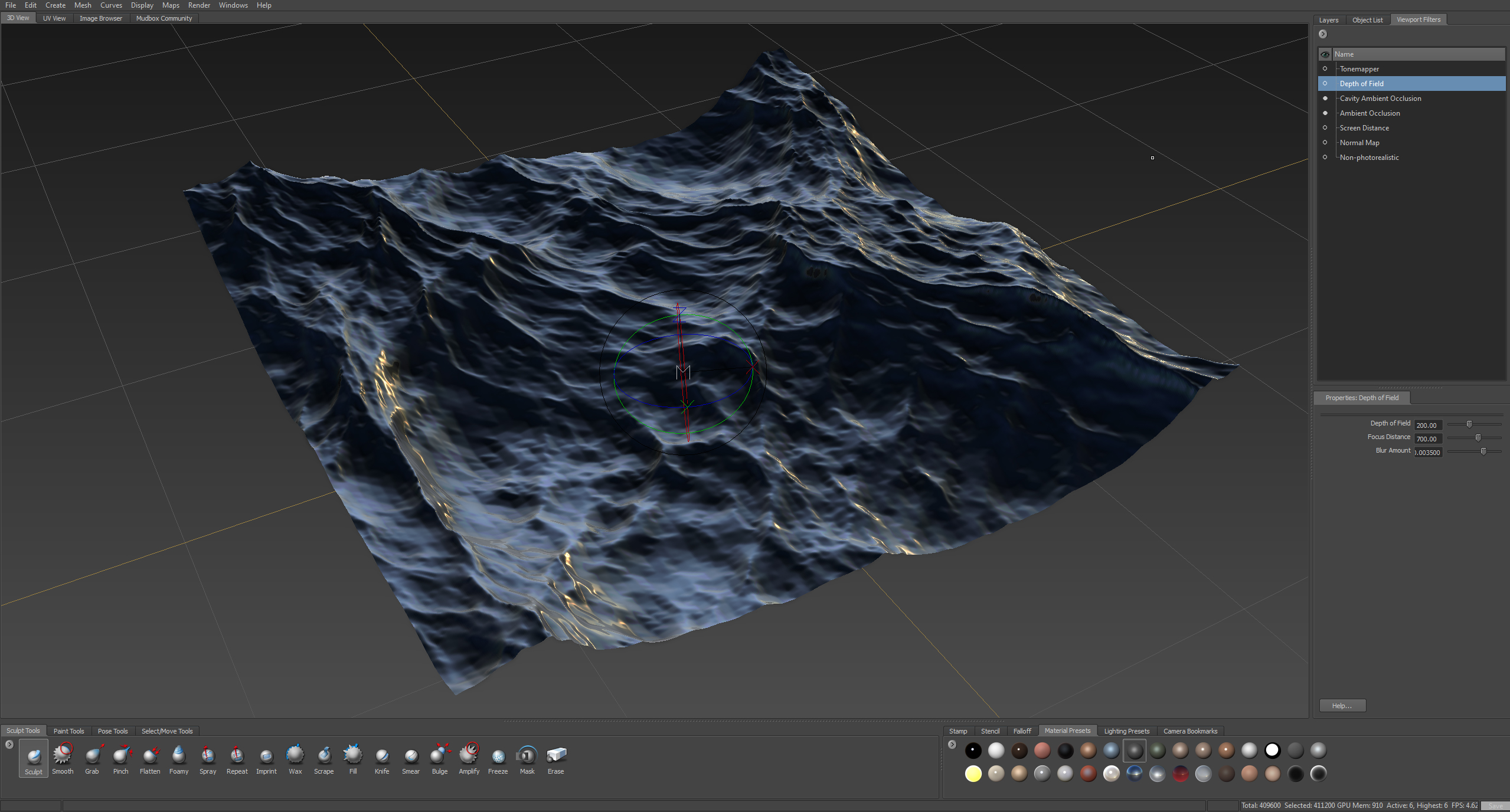 In one of my first posts I mentioned that I had been looking at using Mudbox to sculpt some wave detail displacement maps to use on a rough ocean. I’ve been impressed by the robust performance of  vector displacement maps generated in Mudbox and rendered in 3DSMax, so the idea was to take some of the guesswork out of rendering a procedurally shader displaced ocean by using a series of tiling vector displacement maps that would scroll over each other and blend in and out and whatnot. Using some Houdini style Tessendorf  deformed ocean patches as reference, I was able to sculpt up some near tiling geometry, whose extracted vector displacement map could be applied to a plane. I also generated regular 32bit displacement maps based on the same geometry. The ocean scene is on the long finger but after seeing the incredible primordial landscapes and waterfall (actually Dettifoss, filmed in Iceland) in the opening scene of Prometheus I thought I’d try to make a simple waterfall by using the greyscale displacement maps generated in Mudbox scrolling along some basic geometry. No particle systems or fluid dynamics, just some scrolling textures, this way it could potentially be recreated in realtime. For that reason I chose to use modifier based displacement in Max as I wanted quick viewport iterations that I wouldn’t see until render time with the shader based variant.