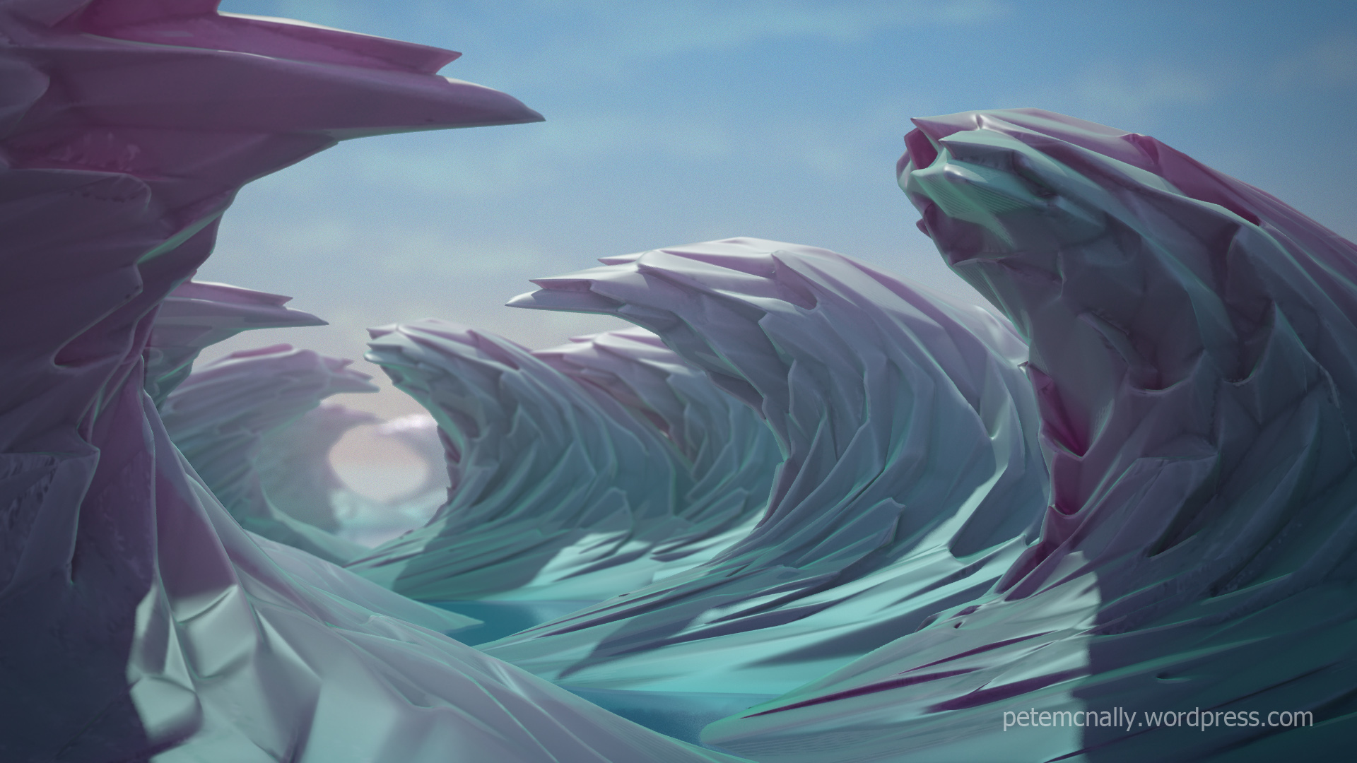 I’ve been experimenting this past week with doing some non-photorealistic look development work in 3DSMax. I’ve been using simple materials, geometry and processes to try and create more complex organic shapes and playing with colours to make up some cartoony landscapes. No hand-painted textures have been used in these images, nor have I used photographs. I’m preparing a blog post to be stuck up soon detailing the techniques involved, here are some results: