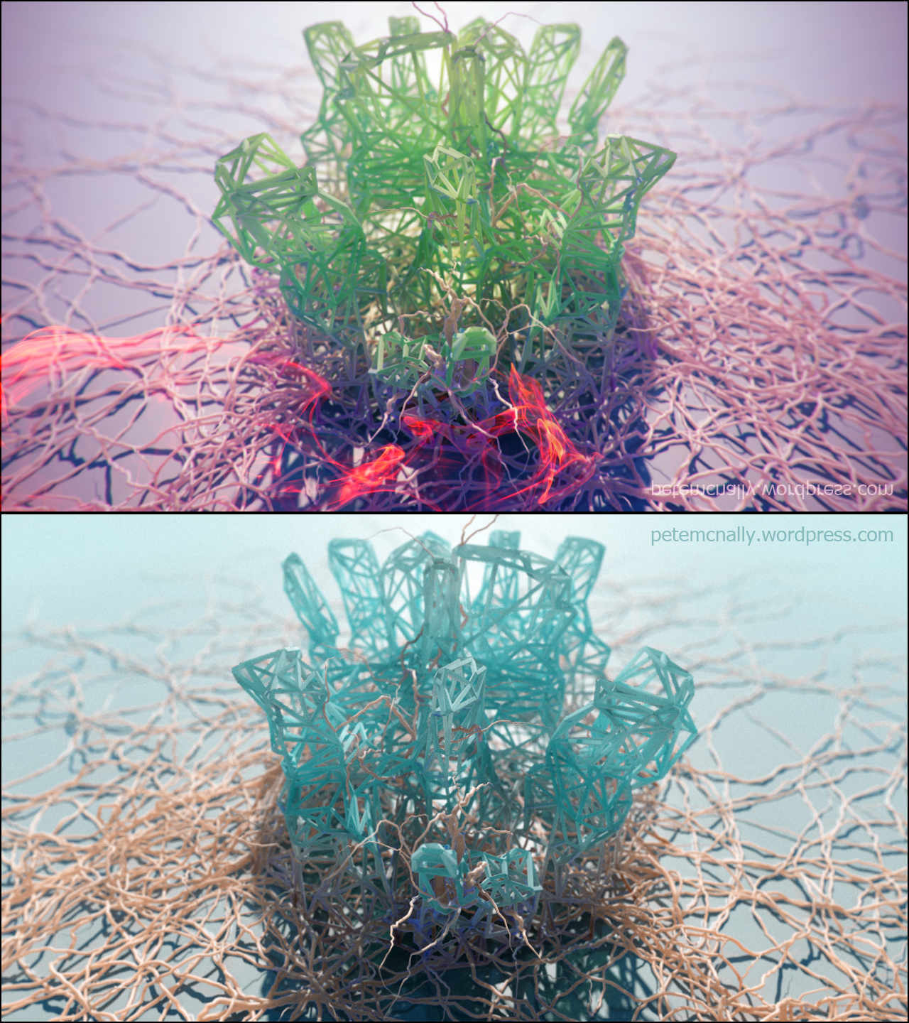 Sub surface scattering materials and thin geometric structures are the order of the day in this experimental piece. Rendered using Mental Ray in 3DSMax and composited in Photoshop.