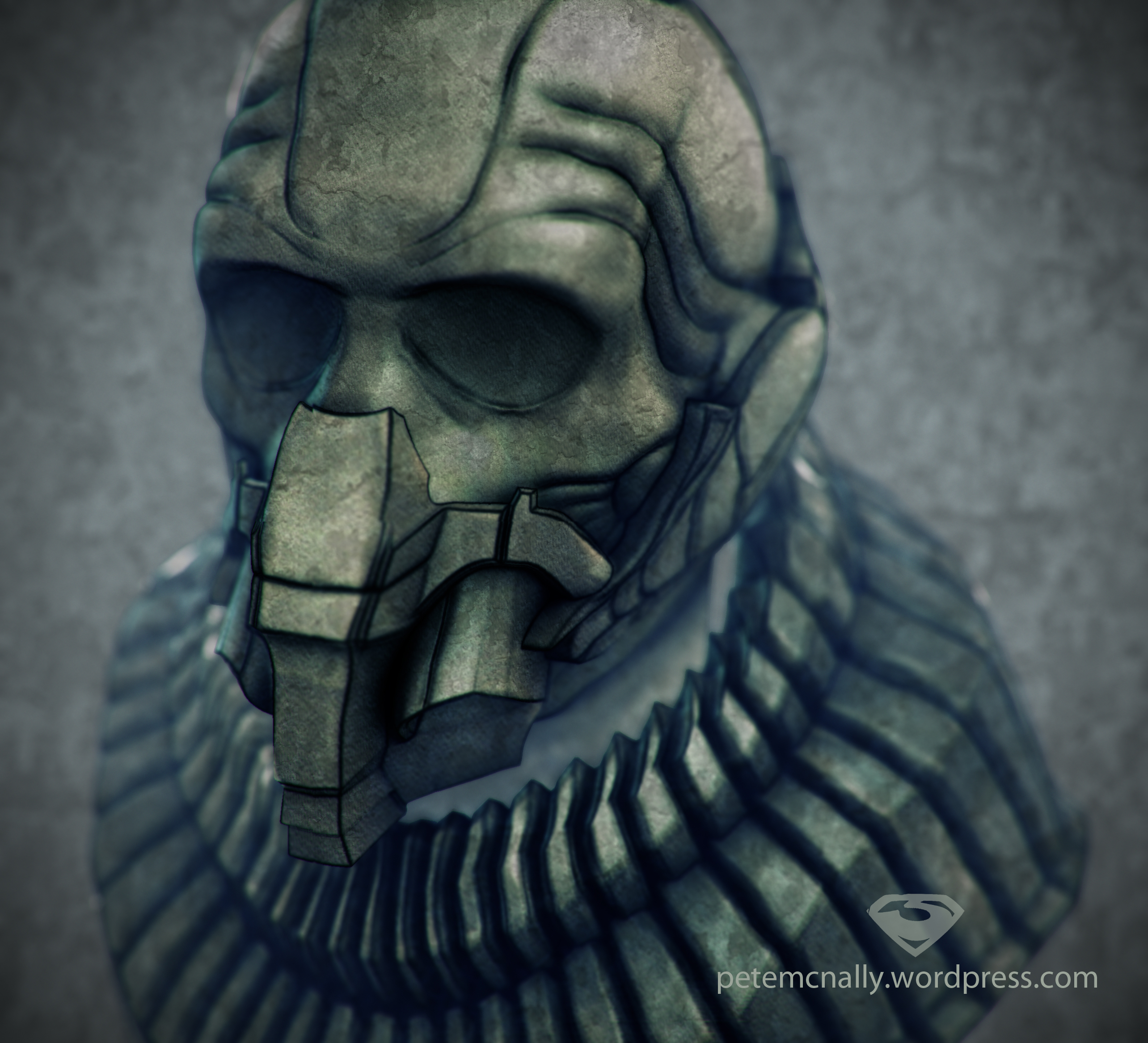 From the limited reference available here’s my take on Zod’s suit from the now showing Man of Steel. The longest part of this was sourcing some reference and the hard surfacing around the breathing mask in 3DSMax, the collar and helmet were lashed out pretty quickly as I was running out of time for the ISS weekly topic. All elements were captured at 2x screen size from the realtime Mudbox viewport, with compositing and post in Photoshop.