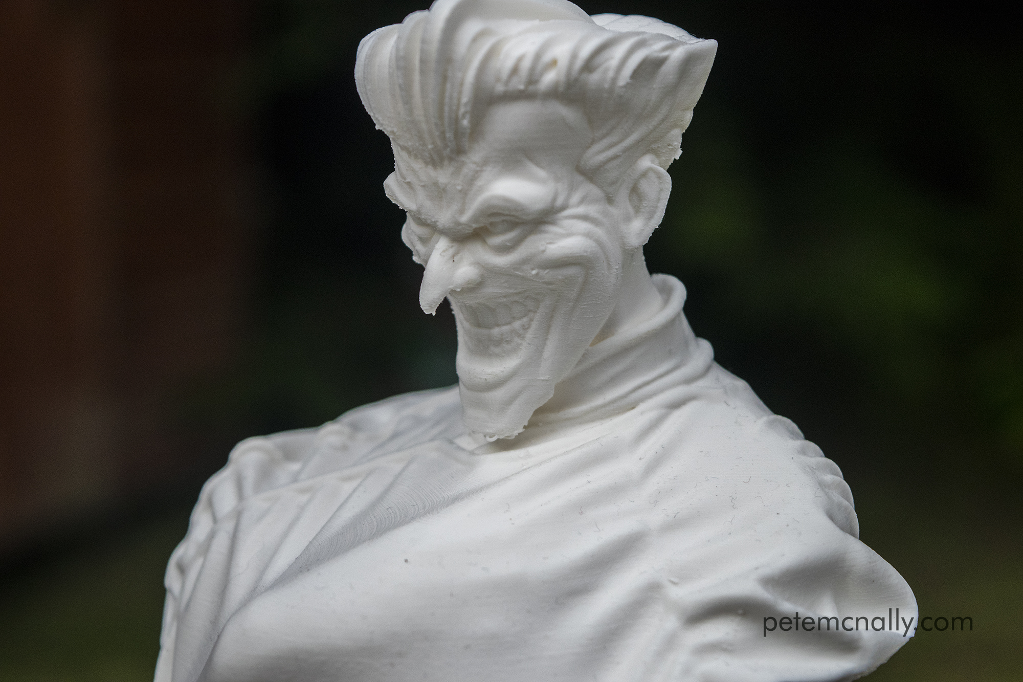 I missed out on a blog post in May, I took a holiday to Italy and have been busy with other stuff. I did get to some more 3D printing, some of it more successful than other attempts. First up was a revised version of my Joker fan art, this time a more substantial piece with further hair detailing and a proper torso modelled, his trademark purple suit from Batman: The Animated Series. Unfortunately due to some bad booleans, the printer left out his collar, bowtie and lapels, leaving a rather gruesome looking scar across his neck, like the memento of some failed assassination attempt at Arkham Asylum.