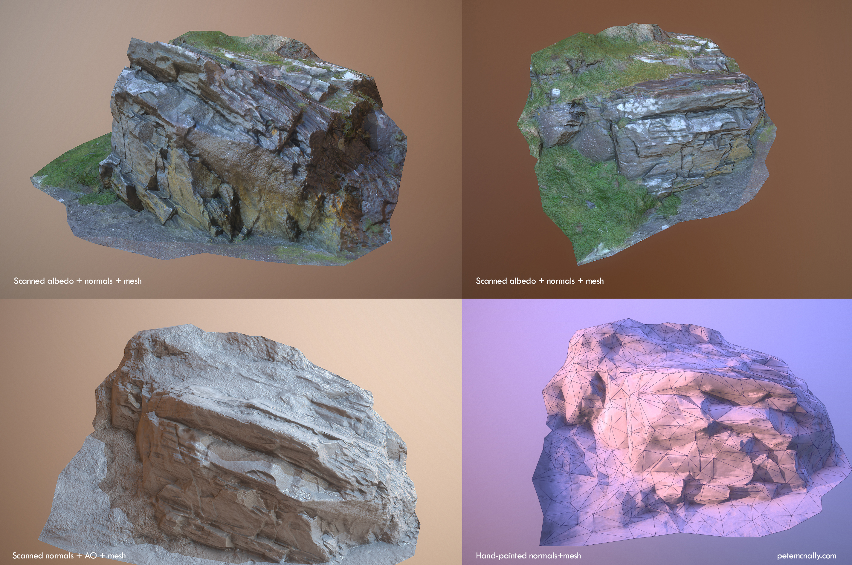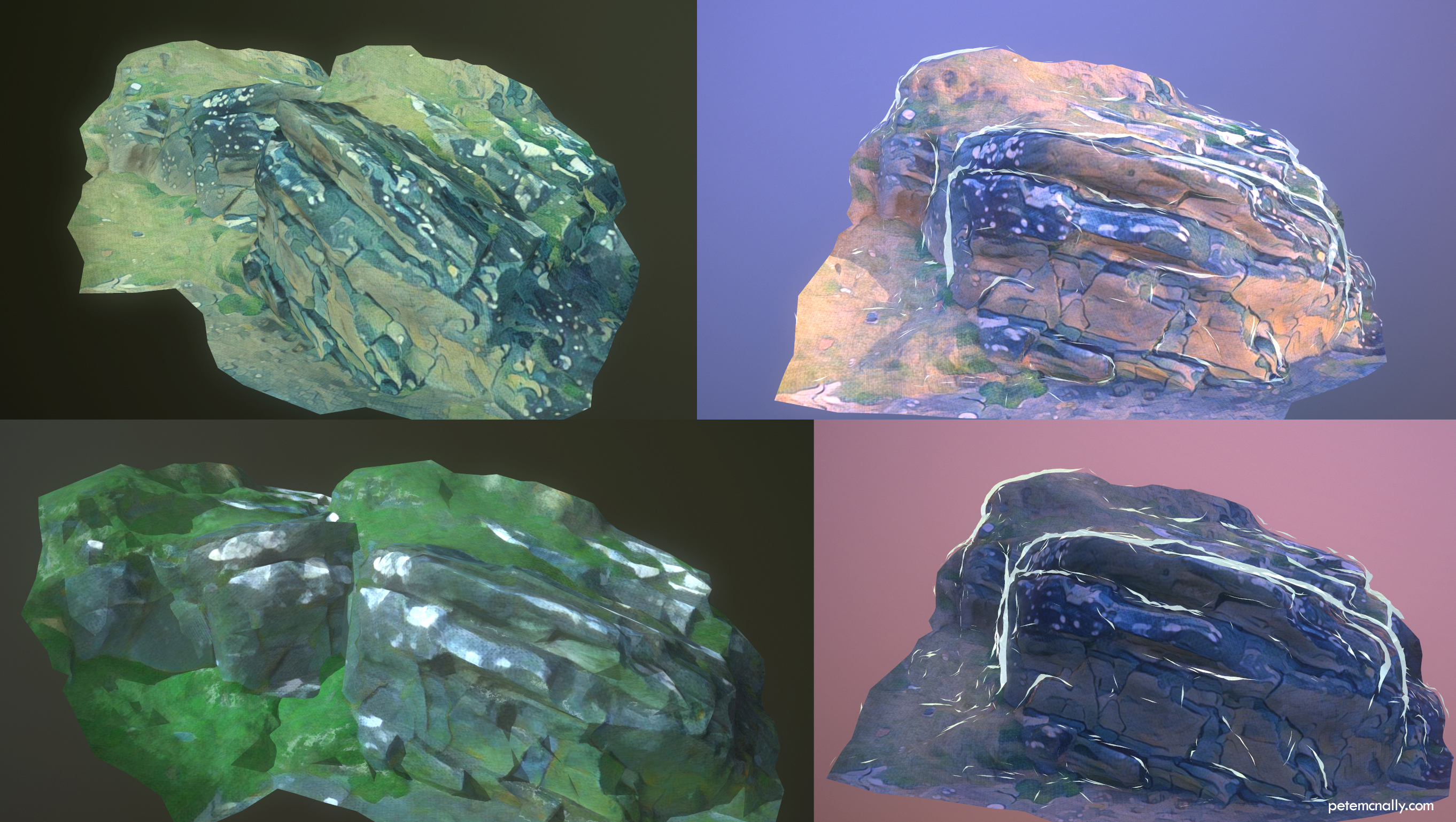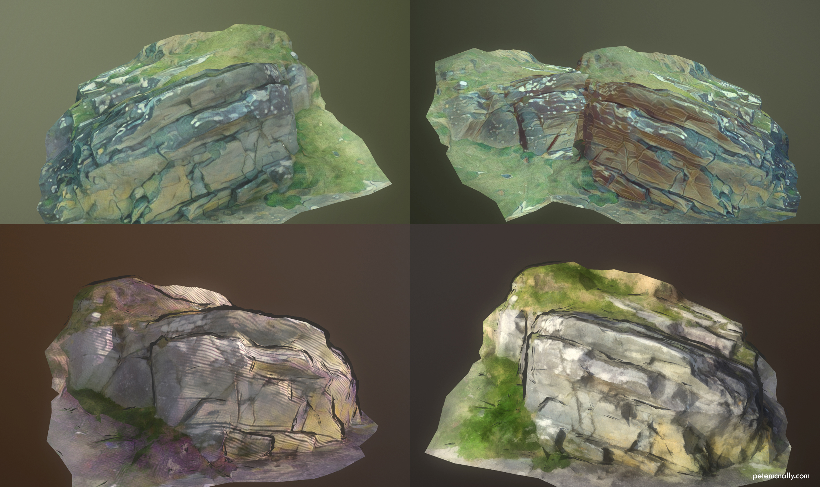 While looking through Google Photos the other day I searched for “rocks”, I was sure I had taken a bunch of landscape pictures ages ago for scanning that I hadn’t used and the search turned up a few. These were taken about 3 years ago, on a smartphone, while pushing a buggy on a broken path, so the quality wasn’t particularly good. I figured if they wouldn’t cut the mustard for a realistic prop, I’d try something non-photoreal with them, maybe something that might feel at home in Okami or Child of Light. Although Agisoft Photoscan processed them into a 3D model quite well, there were some large holes which required fixing in Mudbox, and also missing texture information which I’m currently patching up. I made a low poly version and unwrapped it, baking out normals, ambient occlusion and albedo from the high res scan. I took the albedo texture generated and painted over it in Photoshop using some custom brushes and standard filters to see how if I could get a hand painted feel (the Prisma servers were down, this happens a lot!). I then applied similar techniques to the normal map, removing high frequency detail and generally softening most areas. I also added some geometry for a cel-shaded outline effect. Here are the results of this in real-time: