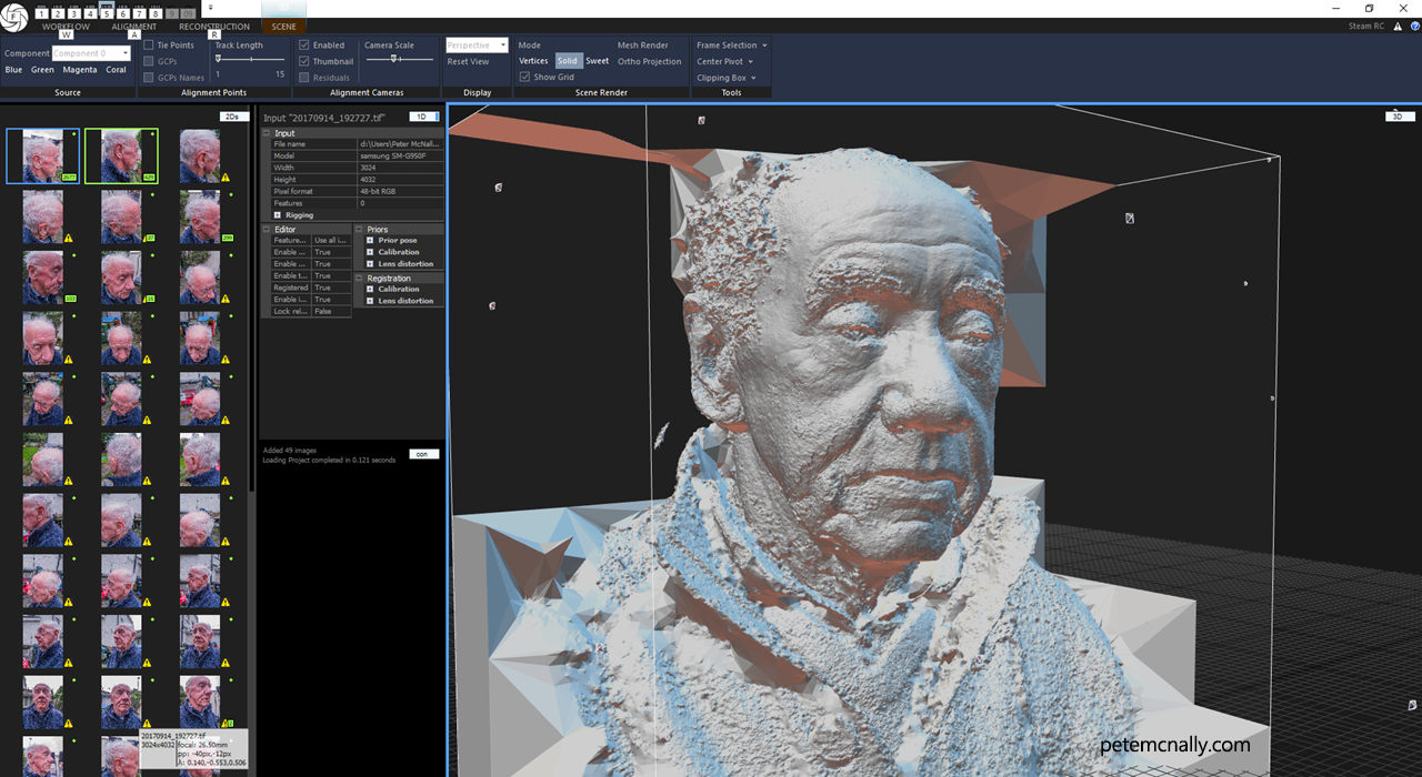 Took me a while to get this update together! This time, I’d like to share an experiment in single camera photogrammetry. I was very inspired by some of James Busby’s recent work on Sketchfab, so much so that I went back to try scanning with another human subject. My Dad dropped by the house one evening and I asked him to sit for me outside, just as the light was fading. I was fairly sure the effort would be wasted due to the failing light, but photogrammetry has surprised me before, so I carried on. I shot about 45 photos in raw, handheld on my phone, a Samsung Galaxy S8. From there, I processed the raw files in a free version of DxO, removing vignetting, chromatic aberration, shadows and highlights where possible, but keeping distortion. Here is the mesh output on normal detail in Reality Capture.