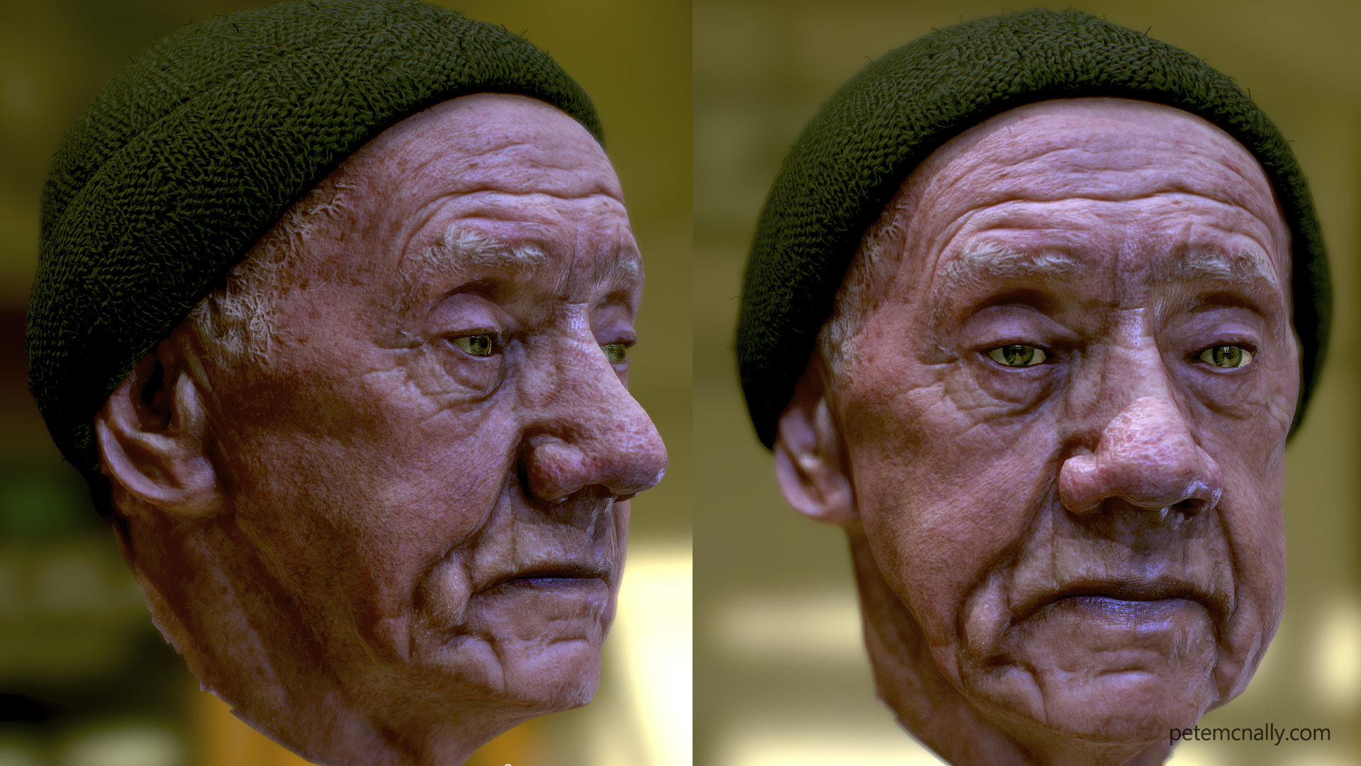 Results out of the box showed some promise. Overall form and volume were there with some detailed areas around the eyes quite well defined. Lots of noise too though, a chunk missing under the chin and nothing at all from the ears back. All in, there was a count of about 45 million triangles.  Generating the albedo texture helped the visuals a lot (see below) but I knew there’d still be cleanup in Mudbox, which has good hole patching for geometry. The relax, smooth and scrape brushes also work well for reducing noise in rough areas.
