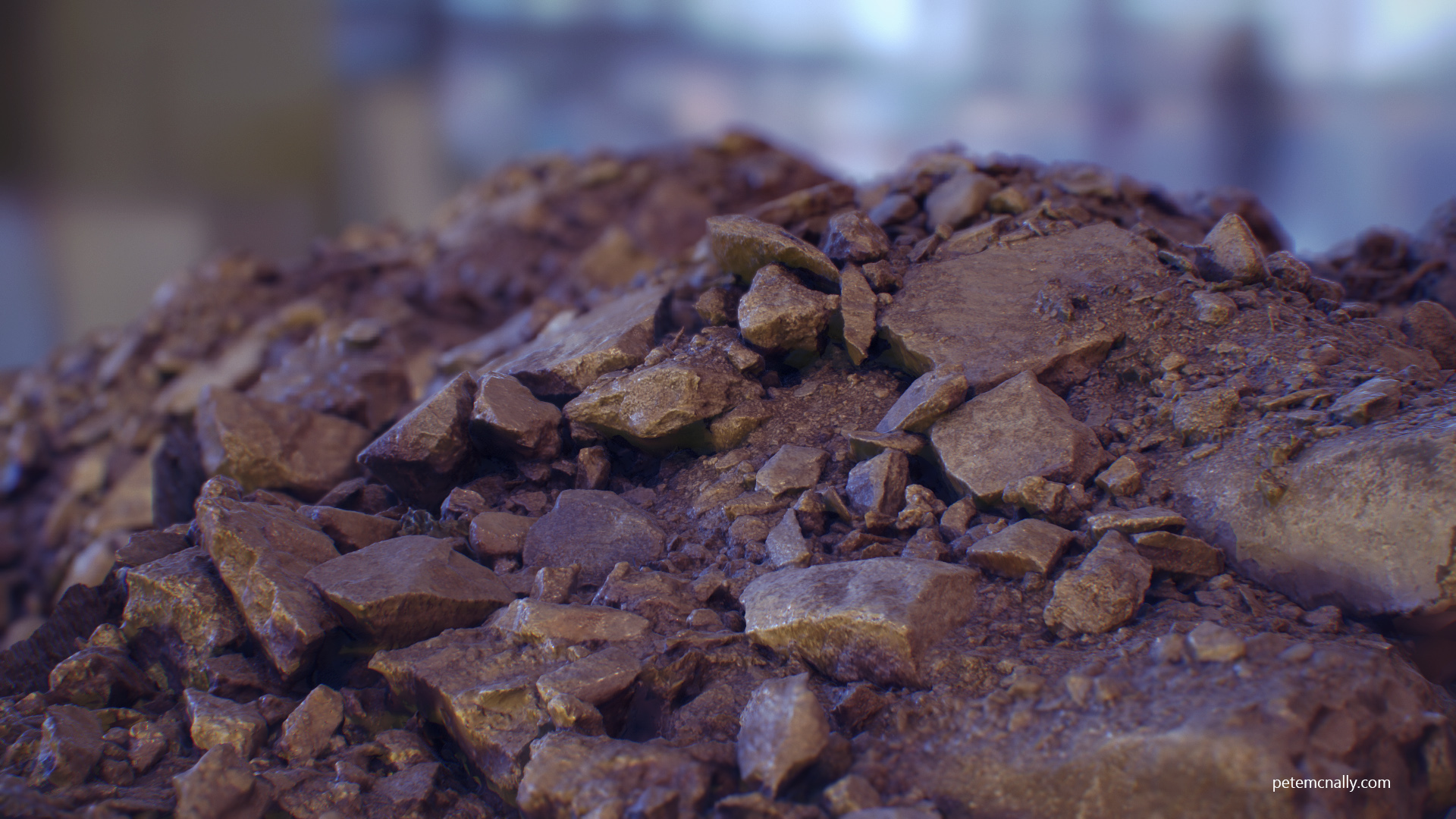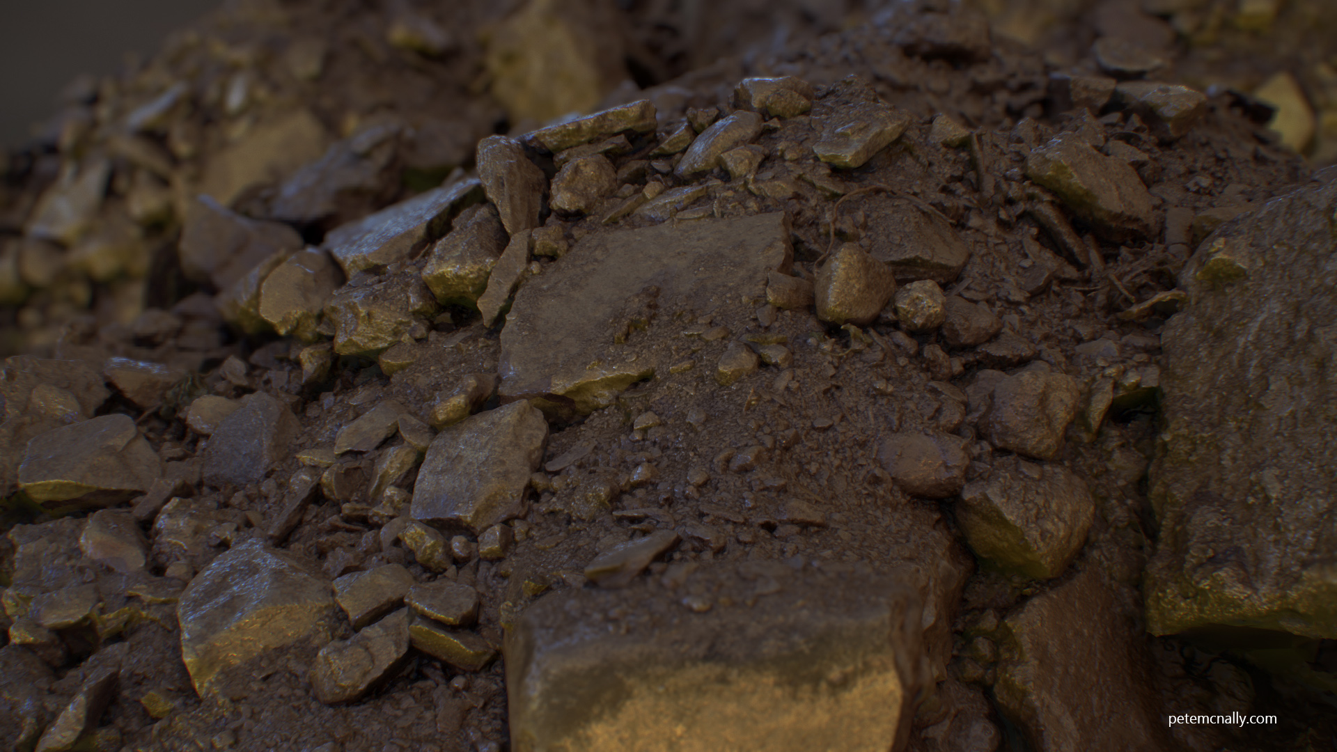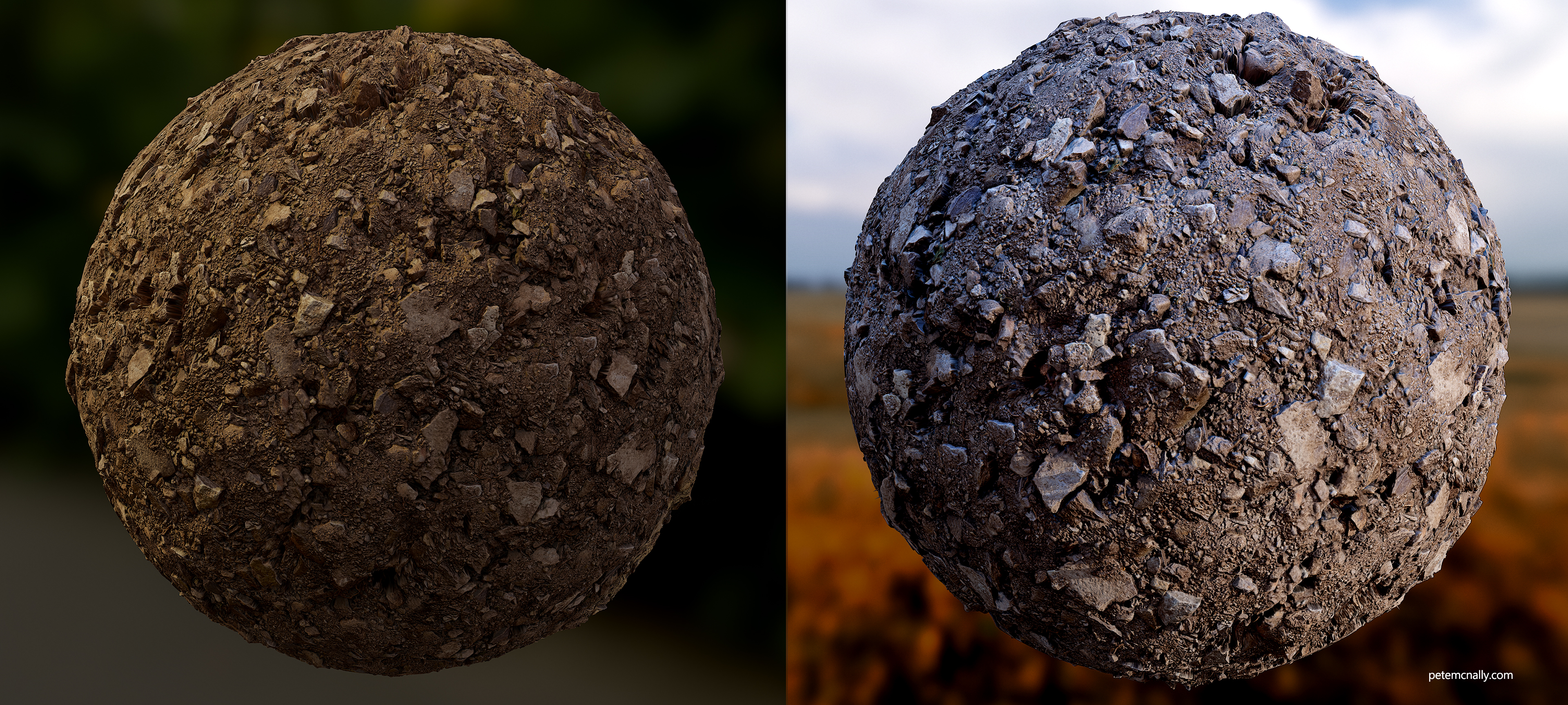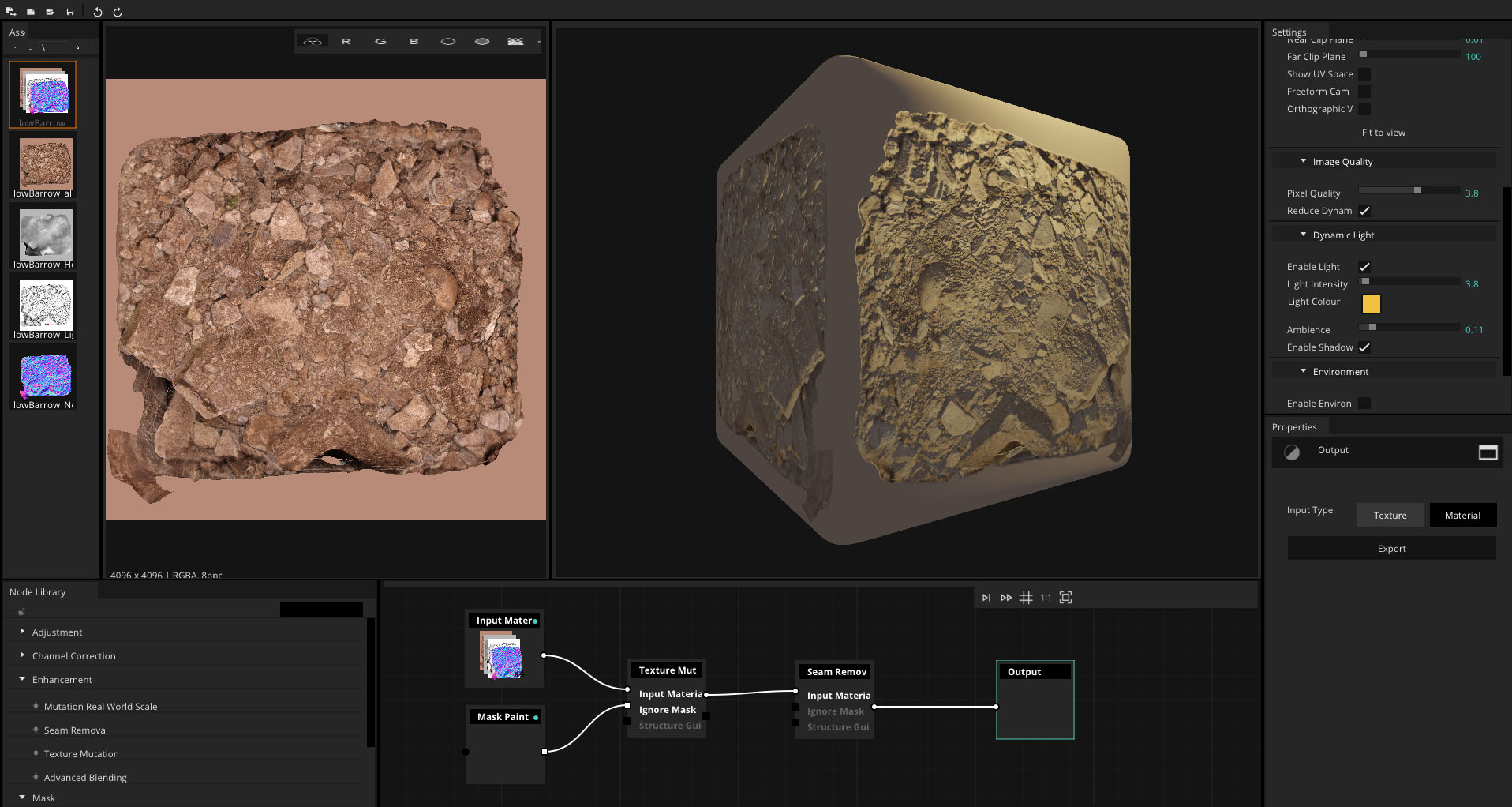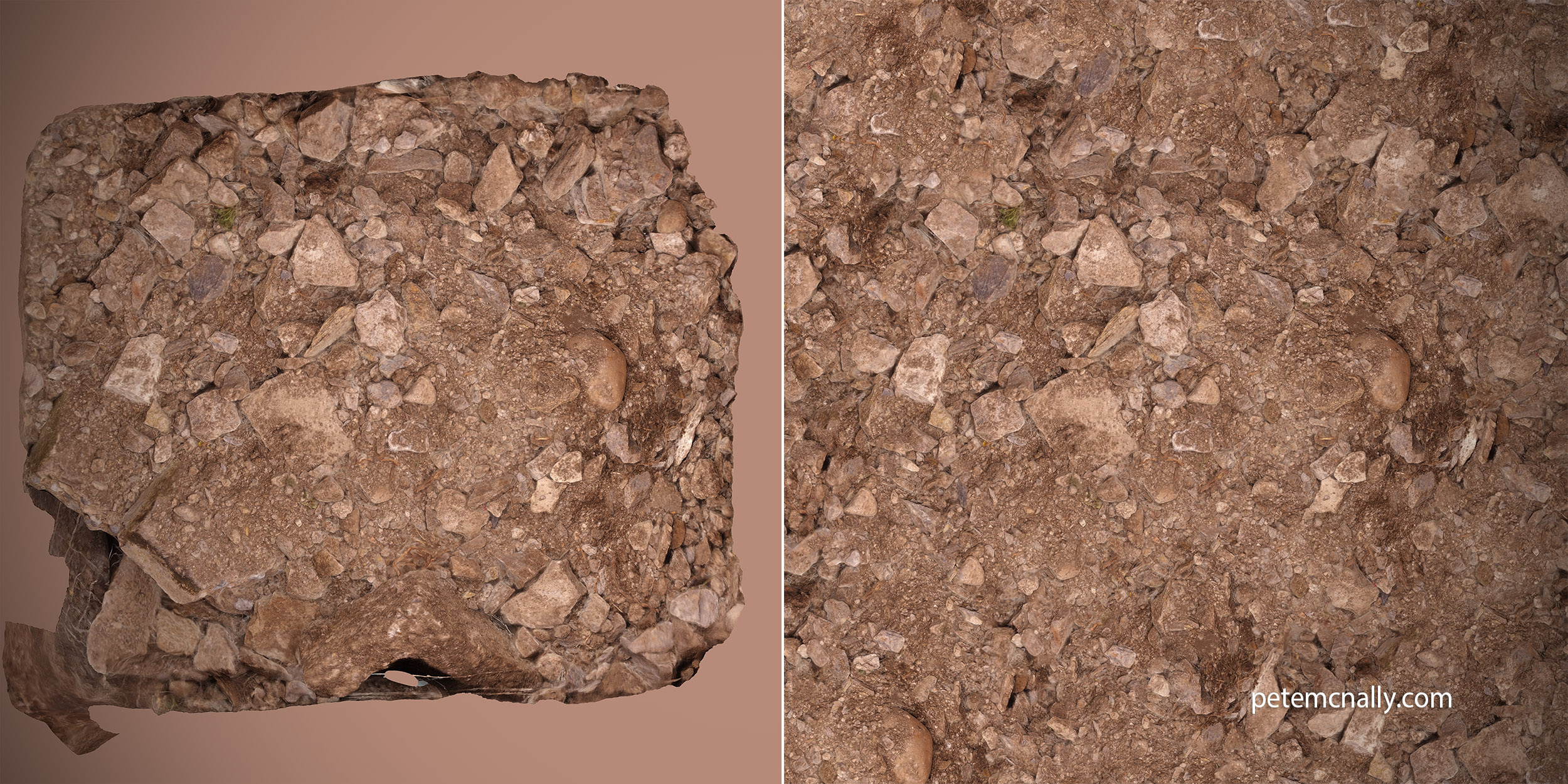 The first of this series of materials from scans was some earthen rubble (blogged about previously here ) in a wheelbarrow I shot on my phone one afternoon. The scan itself worked quite well in places but needed a lot of filling in, and of course parts of the wheelbarrow removed. This would usually have to be done manually in Photoshop or Substance Painter. I imported the textures into Artomatix as a material and connected up Texture mutation and Seam Removal nodes and after a few minutes of communicating with the cloud, my textures were ready to preview. Here’s what Artomatix looks like right now, it’s still in alpha so this is likely to change, albedo input on the left, 3D preview on the right and node graph beneath: